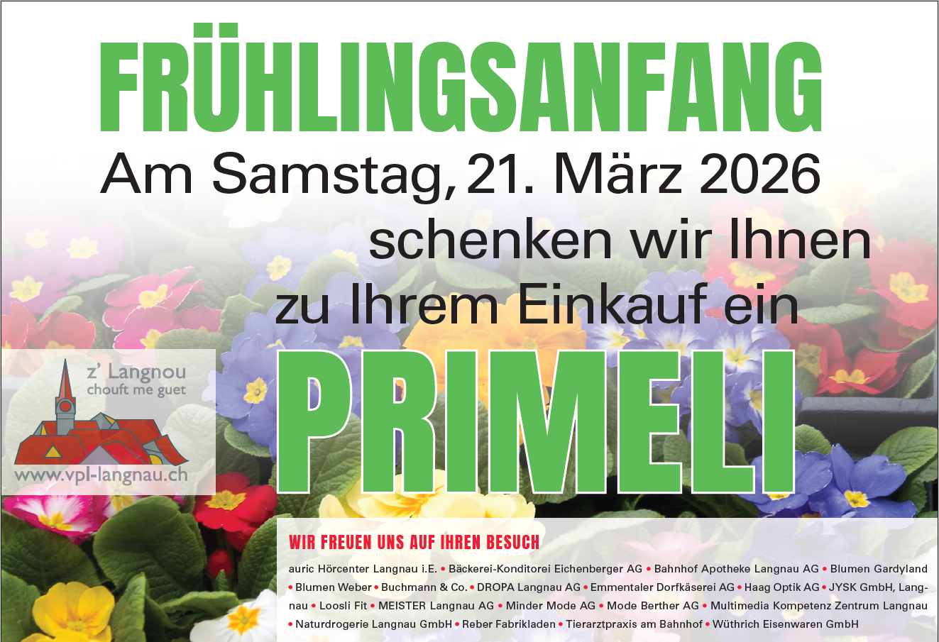 Zum Frühlingsanfang am Samstag den 21. März 2026 schenken wir Ihnen zu Ihrem Einkauf ein Primeli.